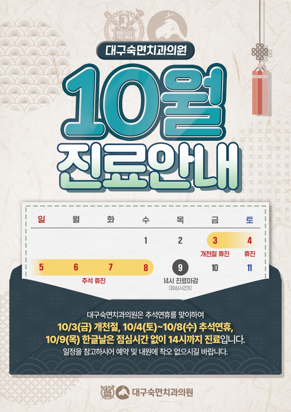 대구숙면치과의원은 추석연휴를 맞이하여 10/3(금) 개천절, 10/4(토)~10/8(수) 추석연휴로 휴진입니다.